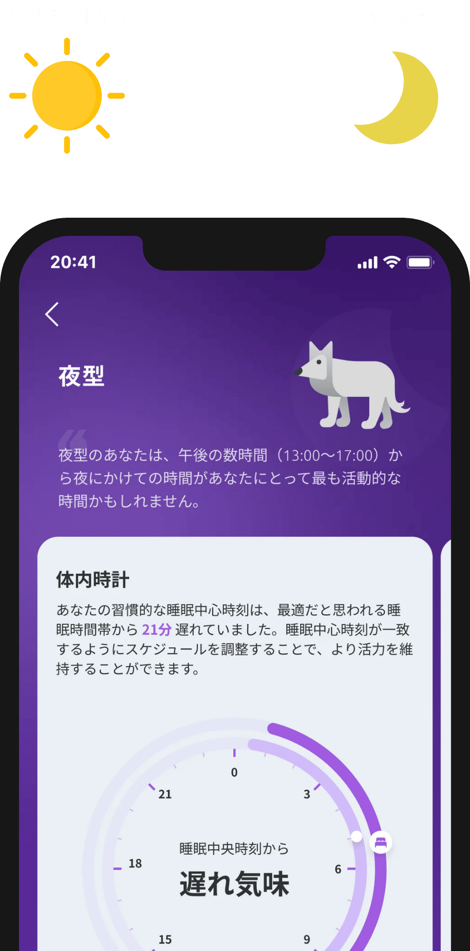 SOXAIアプリでは、あなたのクロノタイプに応じた体内時計グラフと理想的な睡眠時間帯を示します。昨夜の睡眠時間と比較することもできるため、生活リズムの改善に役立ちます。