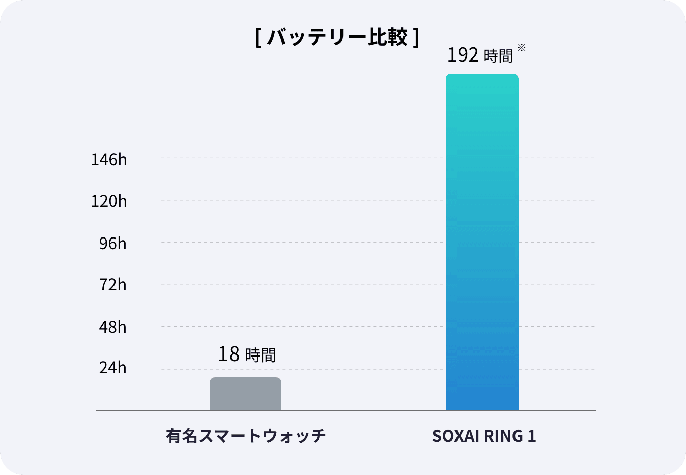 スマートウォッチを腕に着けて寝ることに抵抗を感じる方は多いかと思います。SOXAI RINGなら装着負担が少ないため、自然に・違和感なく睡眠管理を始められます。また、最大8日間の長時間バッテリーにより、翌日の充電を心配する必要もありません。