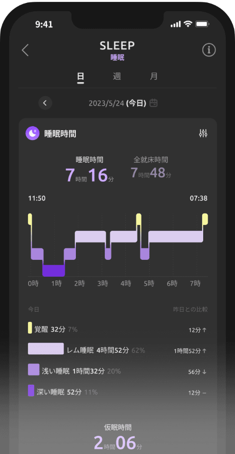 - 心拍数や心拍変動(HRV)のパターンにもとづき、浅い睡眠、深い睡眠、およびレム睡眠の状態を推定します。