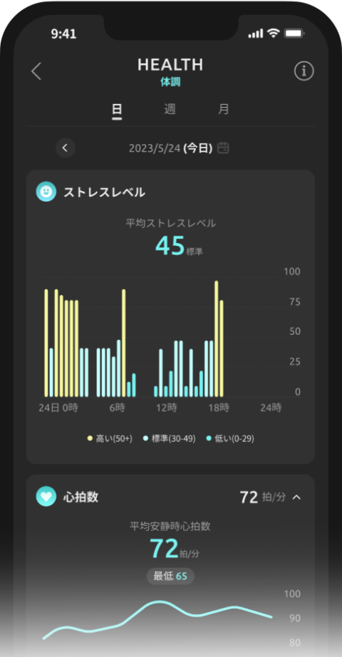 - 安静時の心拍数を一日を通じて測定することで身体の様々なサインを24時間監視します。