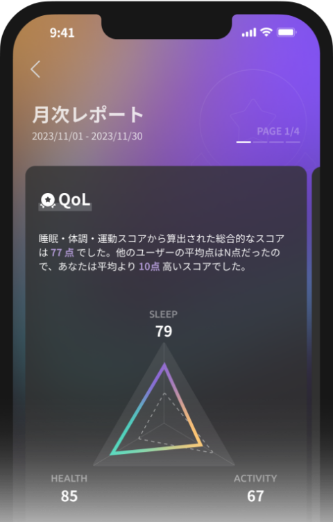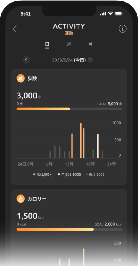 あなたの活動量からアクティビティレベル、歩数、消費カロリーを分析し、独自のアルゴリズムで運動スコアを100点満点で採点します。