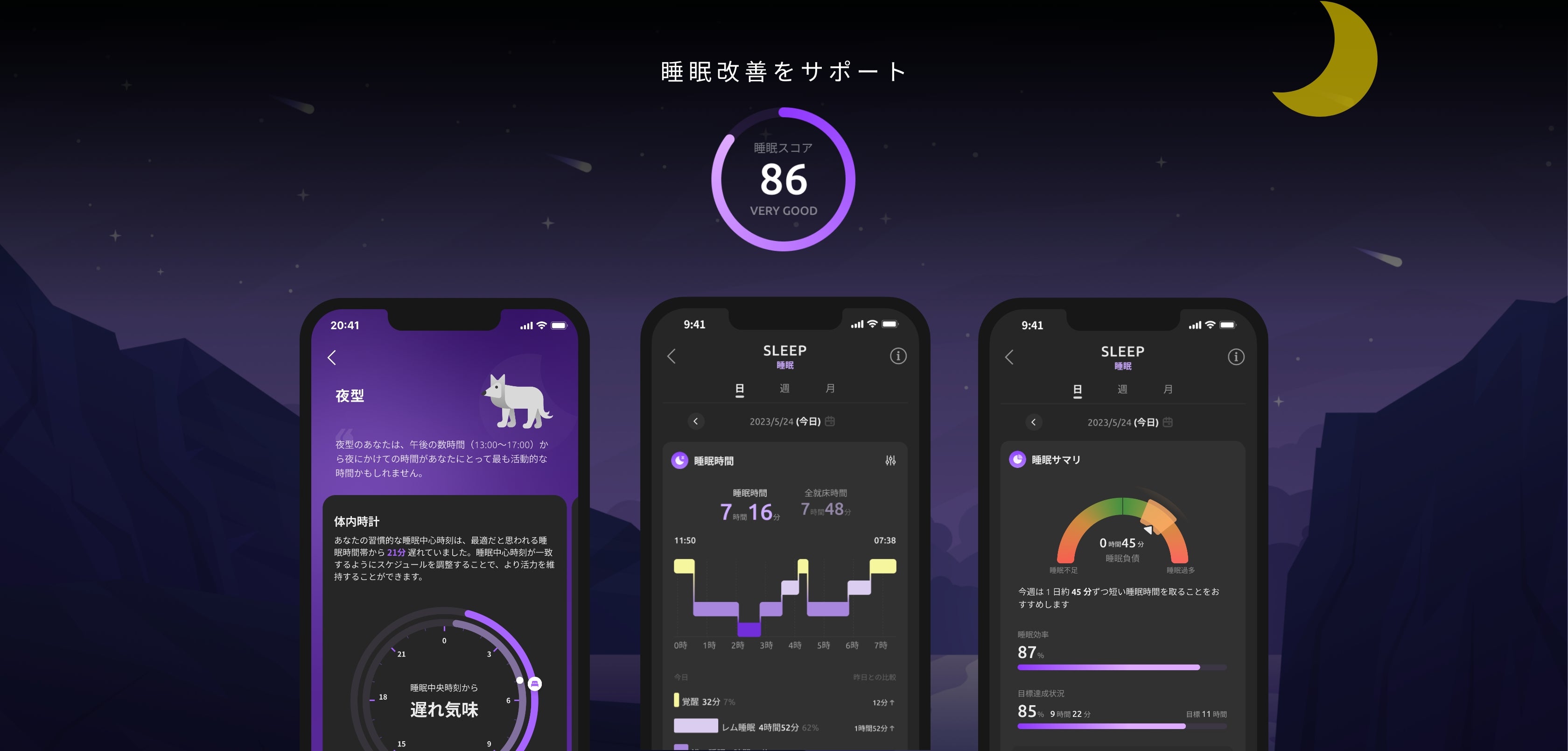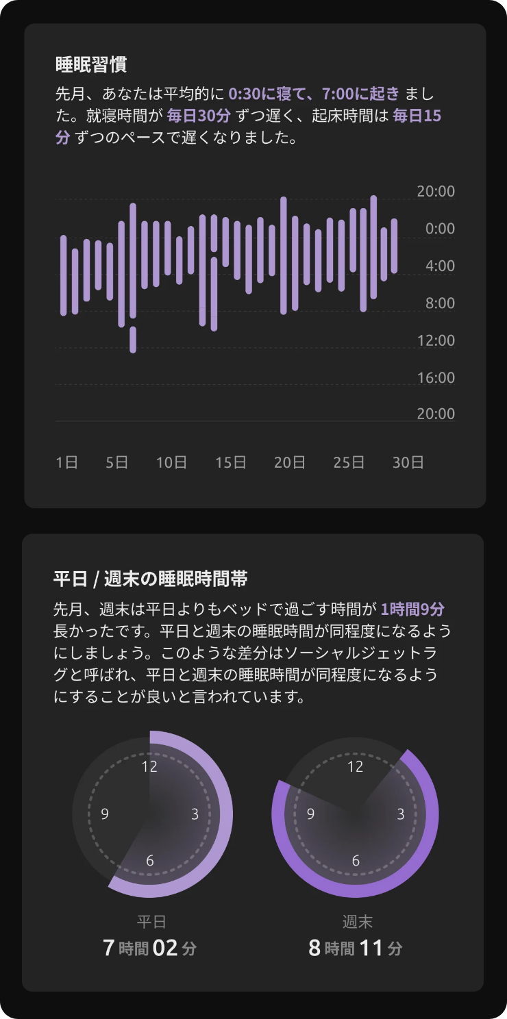 - あなたの睡眠時間帯を可視化し、サーカディアンリズムに基づいた理想的な睡眠時間帯に関する生活のアドバイスを提供します。