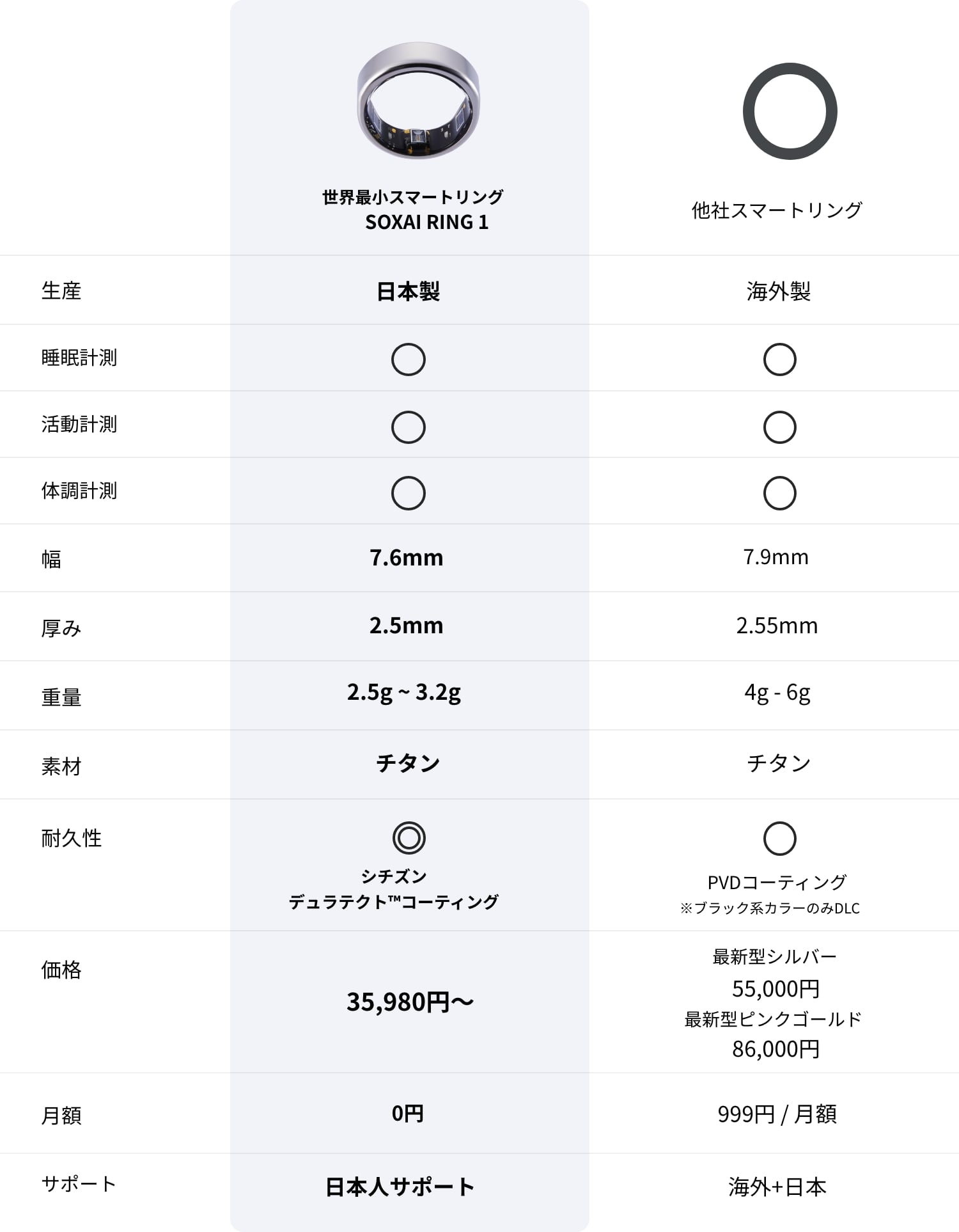 SOXAI RING 1は、健康課題の解決を実現するバイタルセンシング機能を搭載したスマートリングです。幅7.6mm、厚み2.5mmという世界最小サイズとラウンドフォルムを実現することで、日常の暮らしの中で装着負担をかけずに自然な形での健康管理を可能にしました。