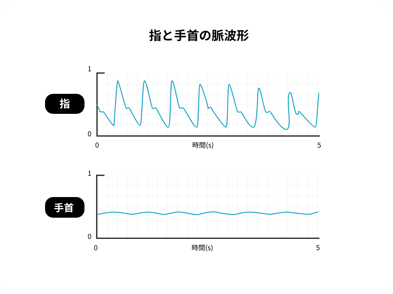 指は手首よりも脈波信号が強いため、医療現場では手首ではなく指で測定されます。